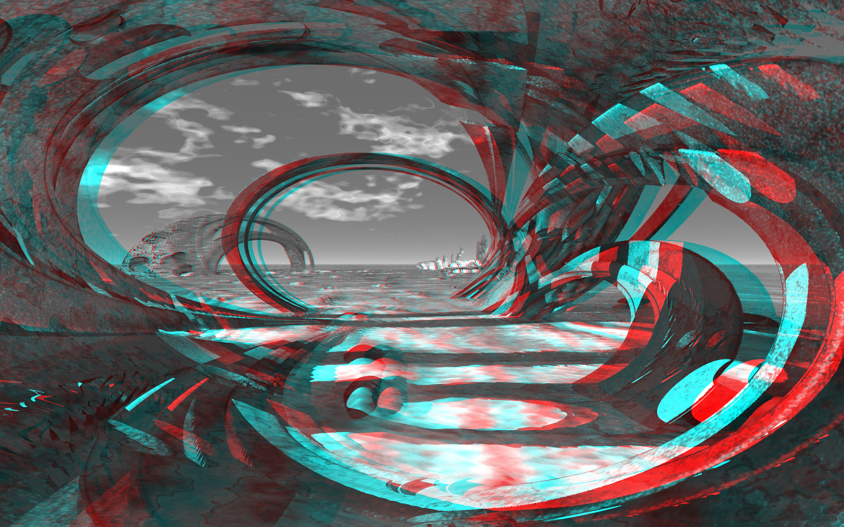 Out of a brown petrified wood cave, a round formation based on a 4D fractal, the view goes out onto a caribbean-like seascape with warm, shallow water. In the distance, unusual rock formations can be seen, made from further hyperspace sculptures. 3D stereo anaglyph image, monochrome red/cyan encoding. Click image for full view. |