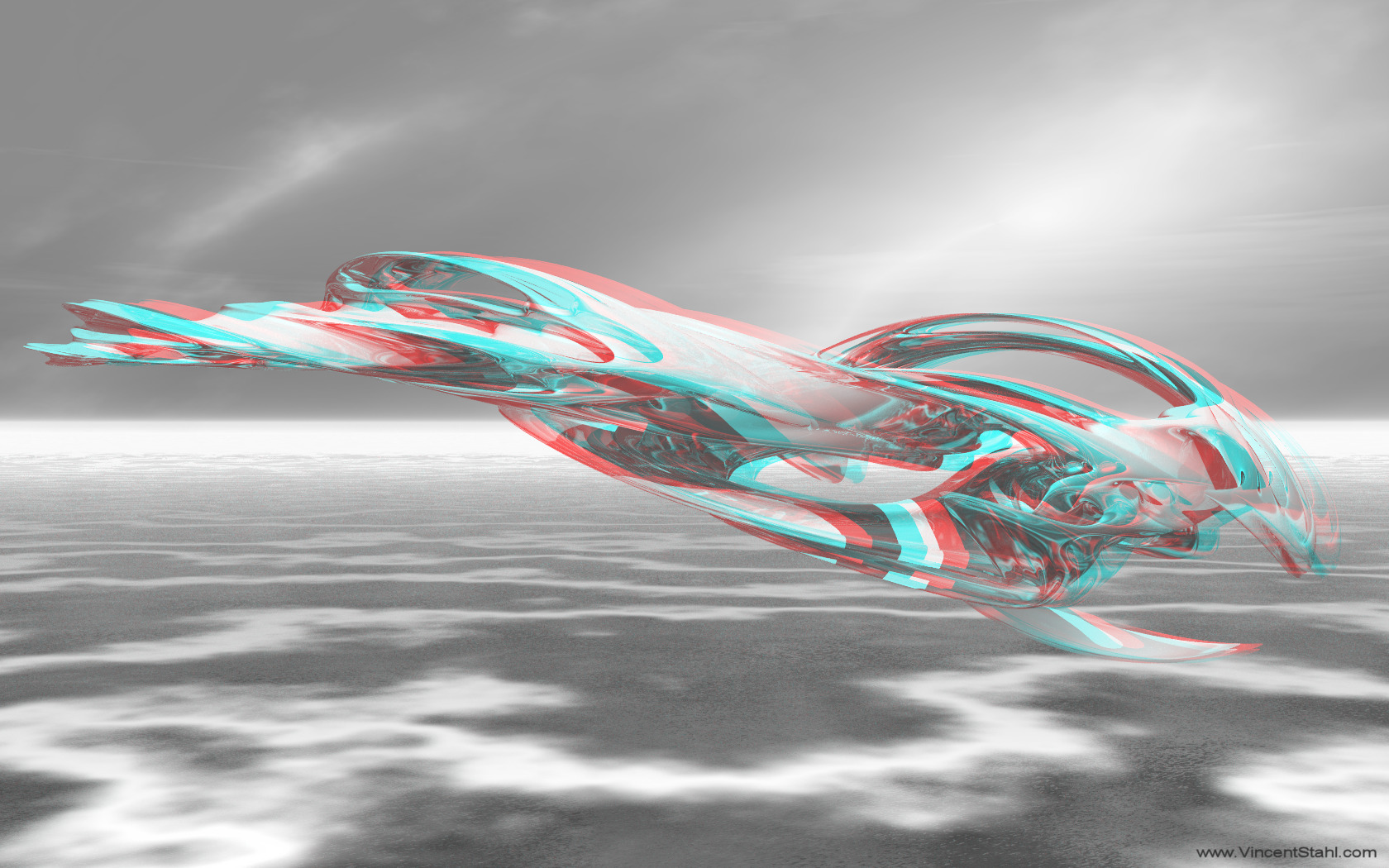 The Dream Cruiser is a fractal sculpture from hyperspace, reflecting the relativity of form within our dreams. At the first glimpse, it looks like a golden supersonic airplane, or space craft, at the next moment it seems like something inconceivable - a form in permament change, depending on it's environment. 3D stereo anaglyph image, monochrome red/cyan encoding. Click image for full view. |