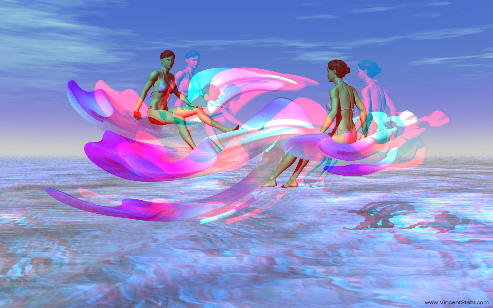 Fractal hyperform in harmonic combination with two women. 3D stereo anaglyph image, coloured with red/cyan encoding. Click image for full view.