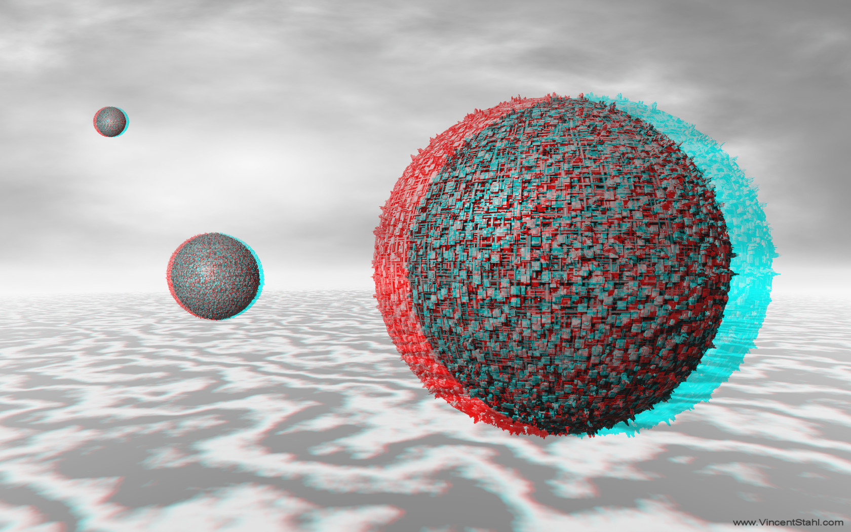 The Steel Moon is an allegory for complex technology systems, assembled from countless modules. Although the blue buildings in this scifi architecture are distributed at random, they have to follow some standard, based on a pipe raster, to form a functional, large unit. Three moons, or satellites, are arranged here in the sky, for a deeper impression against the purple space background. 3D stereo anaglyph image, monochrome red/cyan encoding. Click image for full view. |
