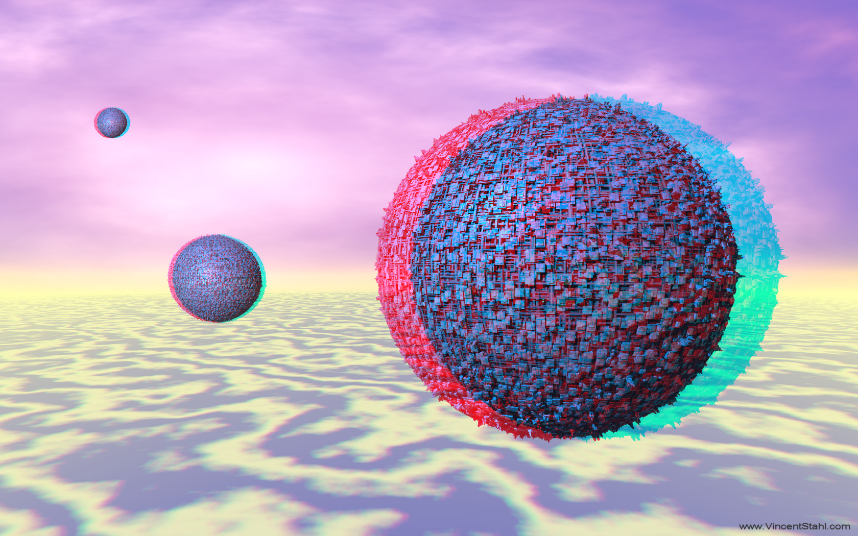 The Steel Moon is an allegory for complex technology systems, assembled from countless modules. Although the blue buildings in this scifi architecture are distributed at random, they have to follow some standard, based on a pipe raster, to form a functional, large unit. Three moons, or satellites, are arranged here in the sky, for a deeper impression against the purple space background. 3D stereo anaglyph image, coloured with red/cyan encoding. Click image for full view. |
