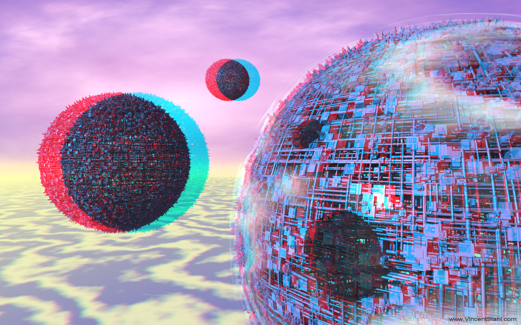 Three blue moons, fractal formations based on thousands of multi layered steel pipes with buildings on top, the largest moon covered with slight clouding. A space installation of scifi architecture, with the two smaller moons acting as satellites. Purple outer space background with clouds. 3D stereo anaglyph image, coloured with red/cyan encoding. Click image for full view. |