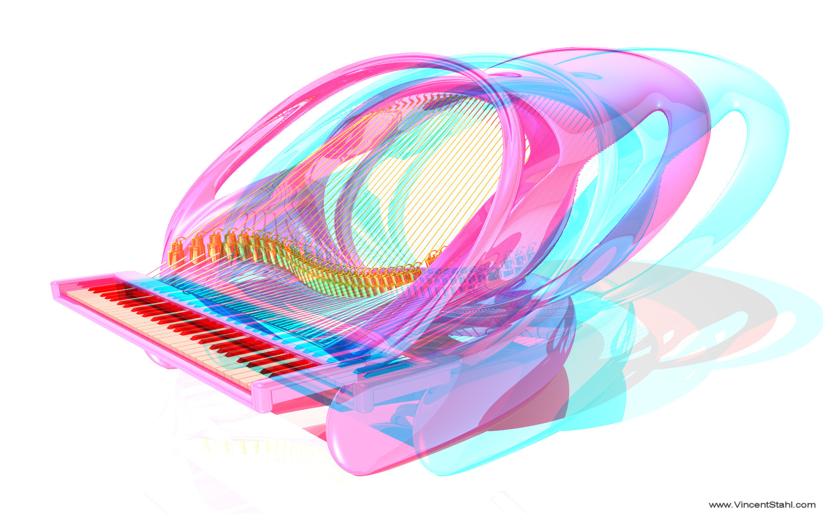 Design study. Fractal, computer generated forms will influence the future design of industrial and everyday products, like pianos. 3D stereo anaglyph image, coloured with red/cyan encoding. Click image for full view.