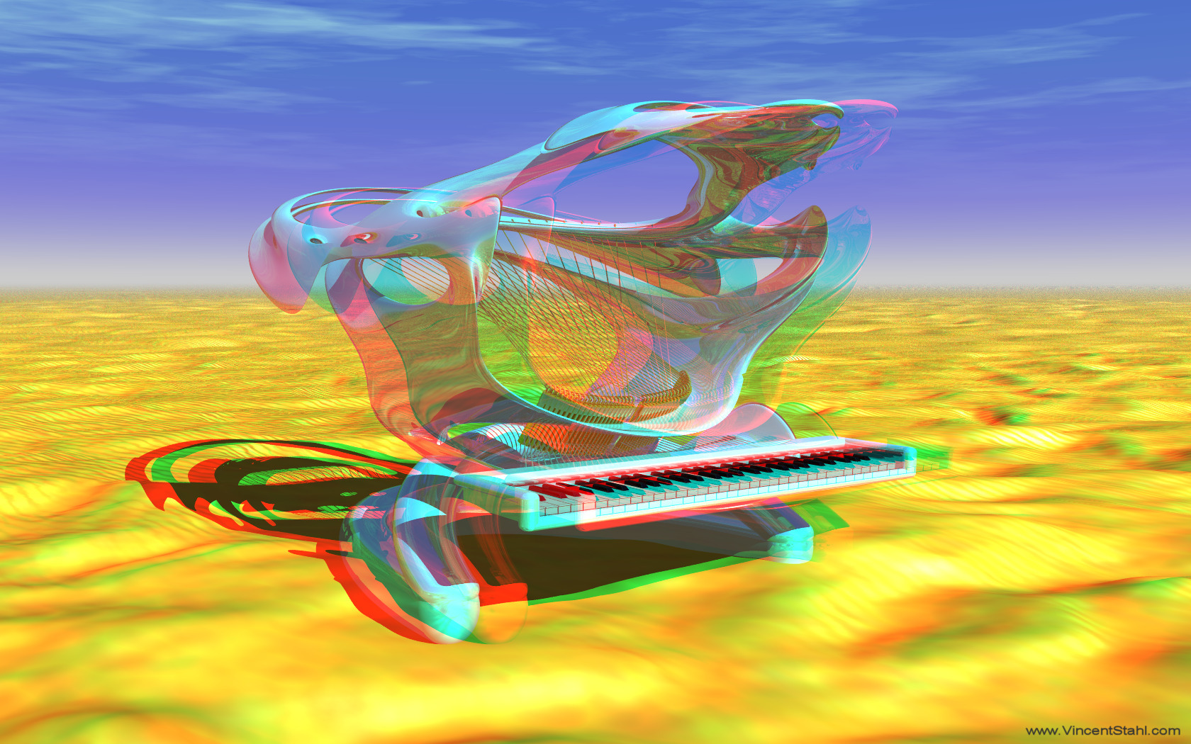 Shark Piano At Desert - 3D stereo anaglyph color