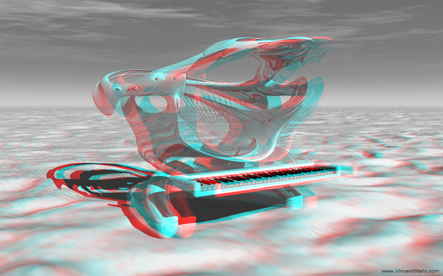 White piano design study in a flat sand desert. Based on an excerpt of a fractal 4D sculpture, this music instrument looks wild and open, like a shark fish. Future design of industrial goods and even pianos will be more and more influenced by the power of fractal form finding. 3D stereo anaglyph image, monochrome red/cyan encoding. Click image for full view. |
