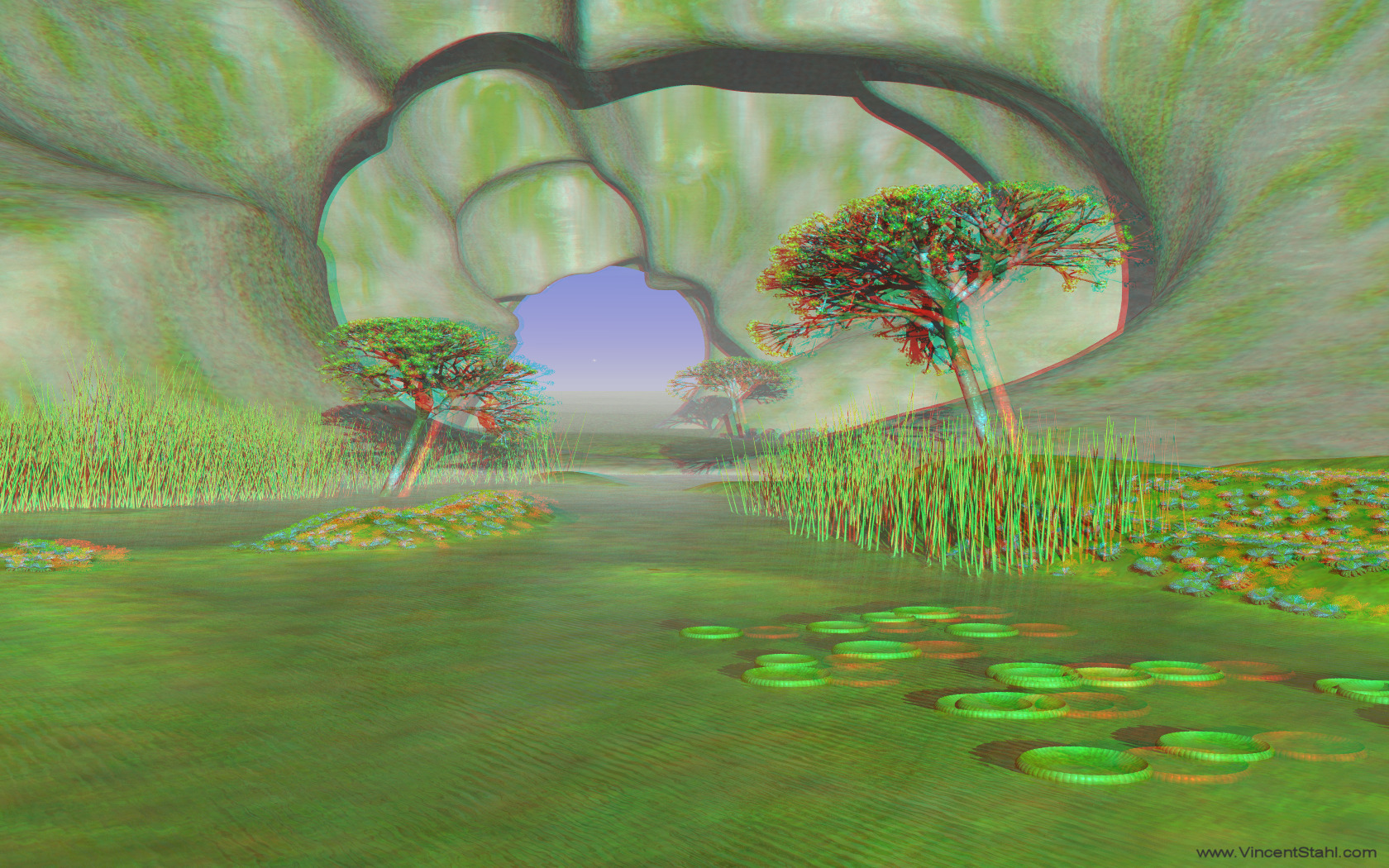 Large fractal stone cave, the walls covered with green moss. Ground covered with shallow water, reed, and water lilies. Fractal trees arranged versus the escape point. Meditative landscape image, slightly inspired by Japanese garden arrangements. 3D stereo anaglyph image, coloured with red/cyan encoding. Click image for full view. |