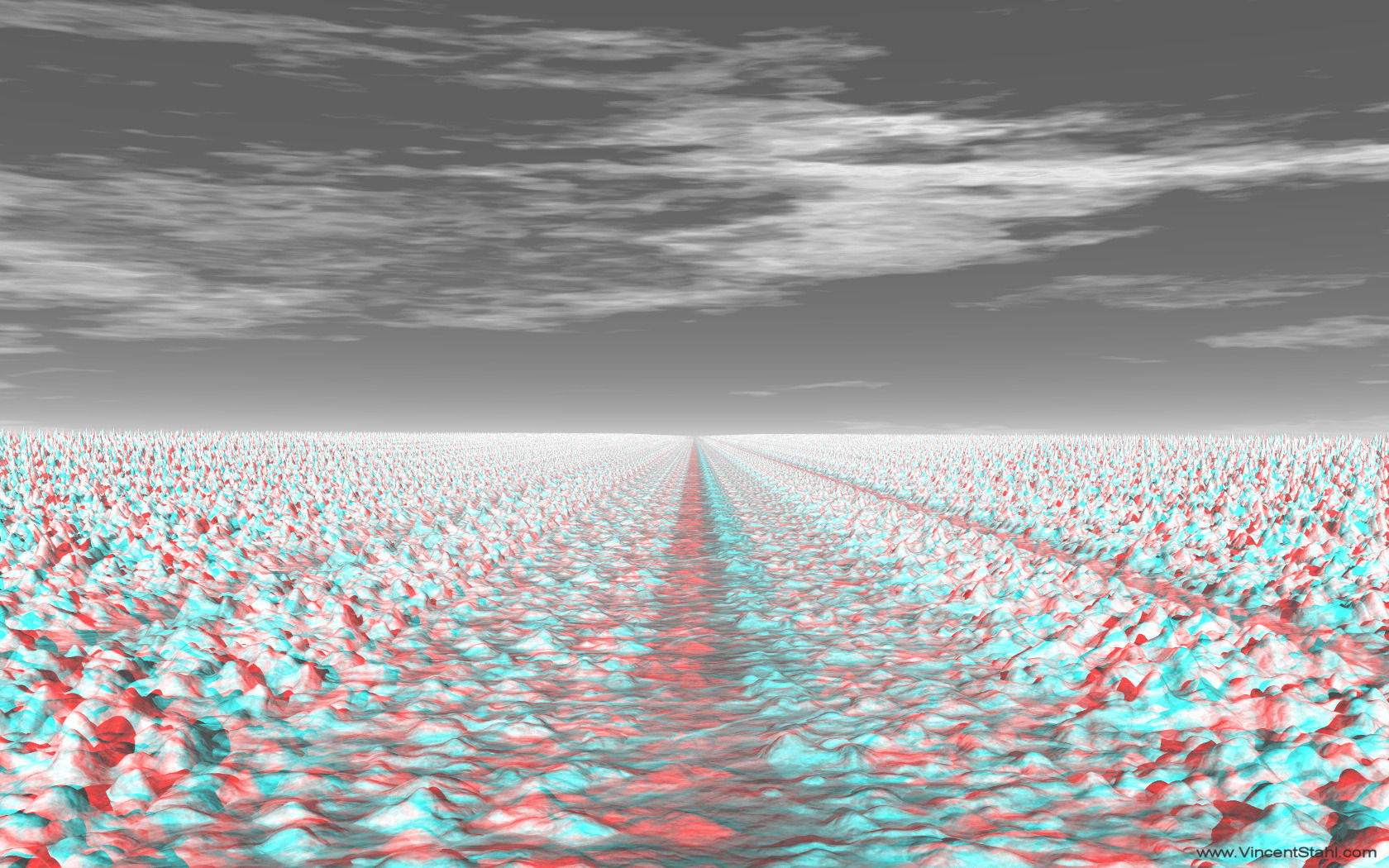 Ice landscape with unique symmetry and wide open space. Blue-cyan ice ground covered with white snow, with an infinite, straight path in the middle, reaching until the far horizon. A meditiative, arctic landscape scenery. 3D stereo anaglyph image, monochrome red/cyan encoding. Click image for full view. |