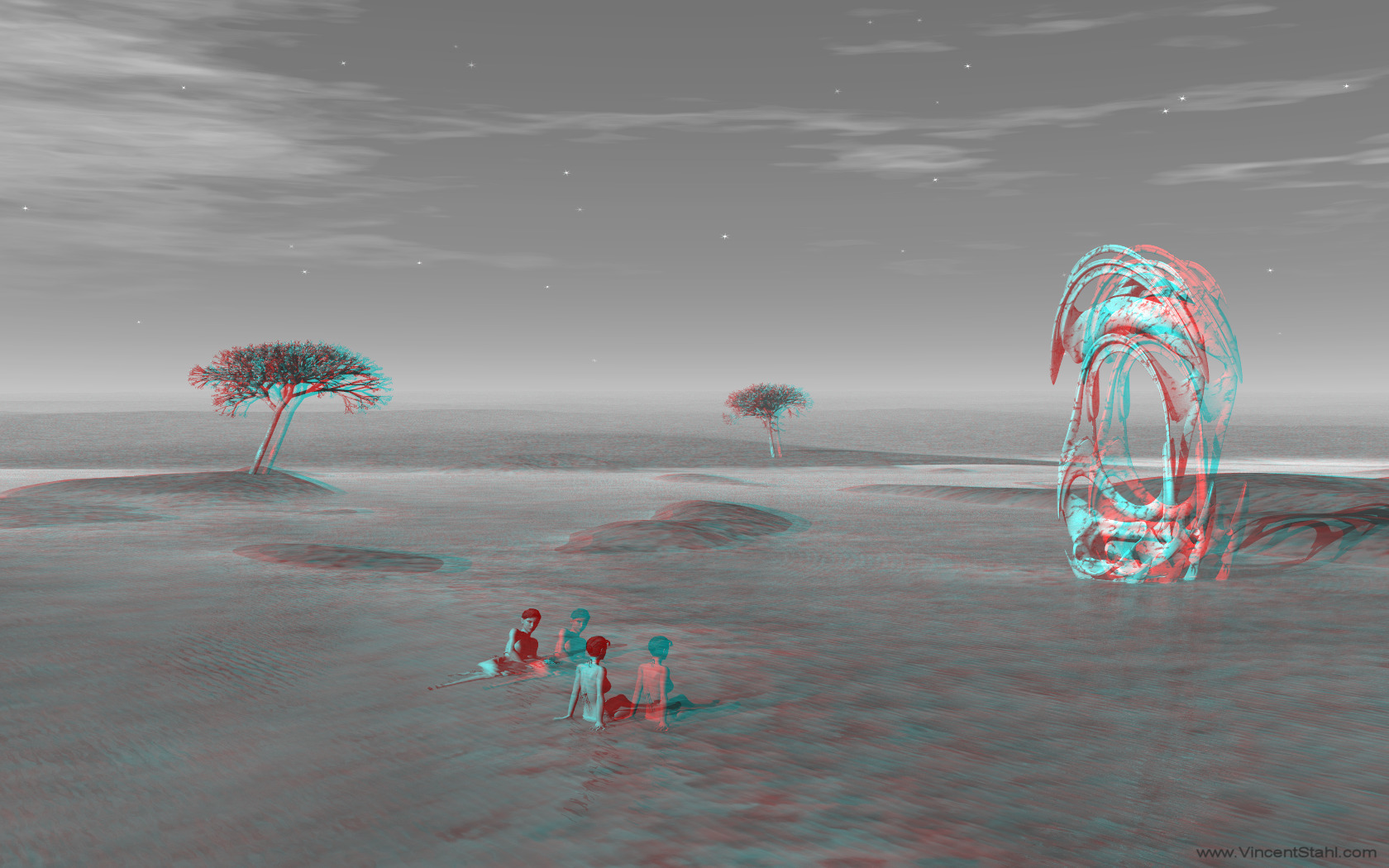 Landscape with shallow waters, fractal trees and a single, white marble fractal sculpture. Green meadows covered with shallow water, soft fog of dawn around the horizon. Two bathing women in front of the sculpture. Fractal hyperform sculpture, and two bathing women. 3D stereo anaglyph image, monochrome red/cyan encoding. Click image for full view. |