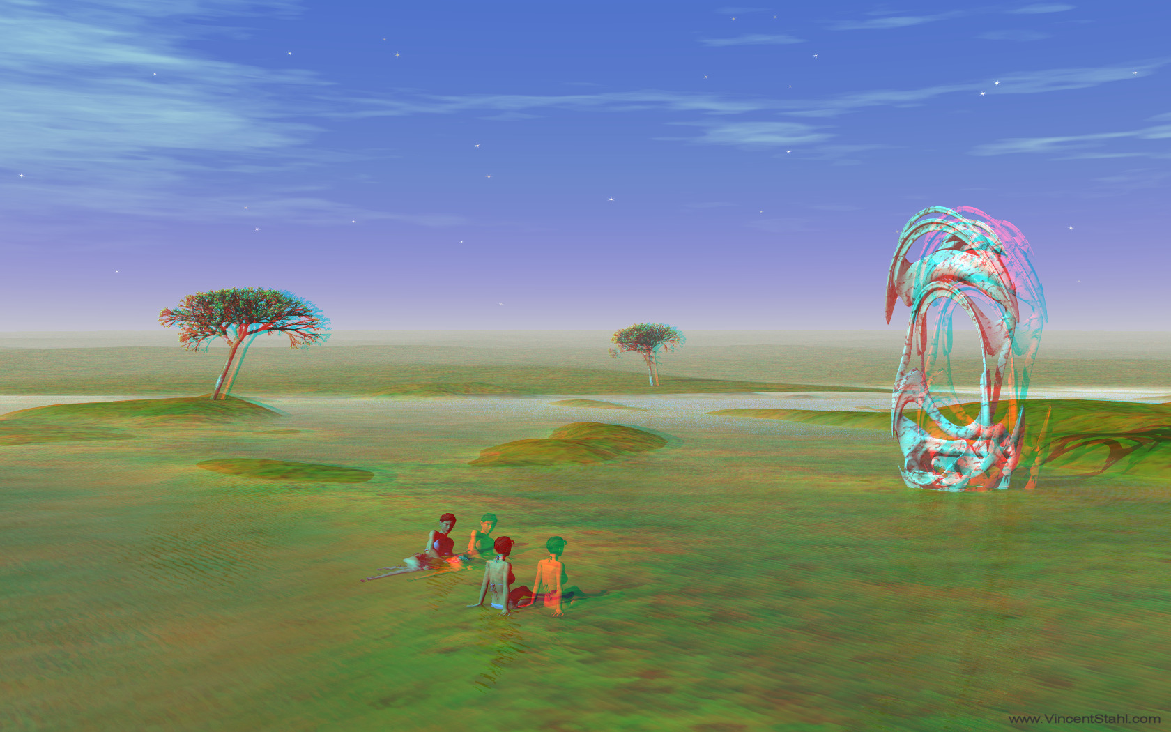 Landscape with shallow waters, fractal trees and a single, white marble fractal sculpture. Green meadows covered with shallow water, soft fog of dawn around the horizon. Two bathing women in front of the sculpture. Fractal hyperform sculpture, and two bathing women. 3D stereo anaglyph image, coloured with red/cyan encoding. Click image for full view. |