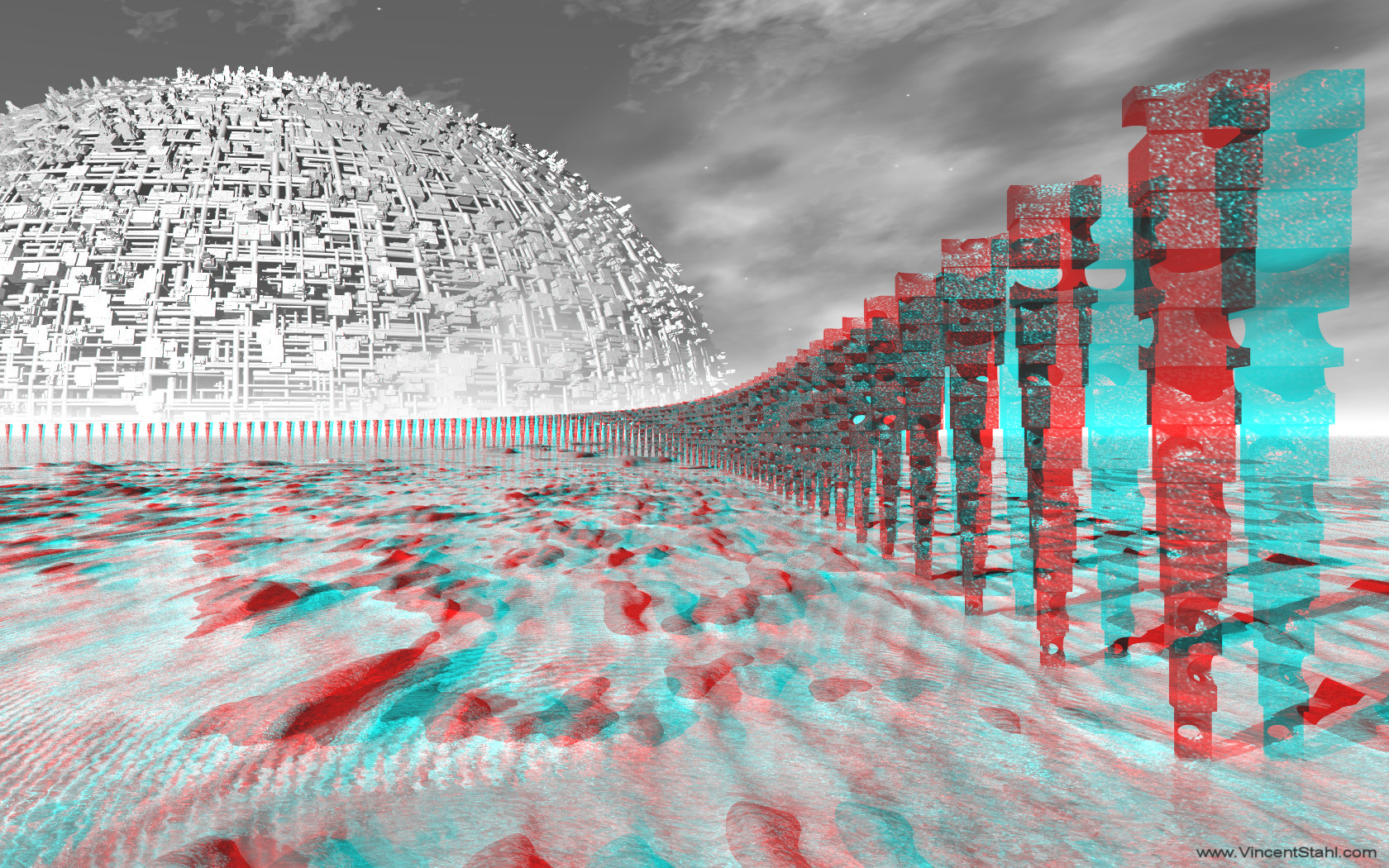 Abstract metal sculpture poles standing on a flat stone ground with shallow water, arranged as a 3D formation into the plane. White Steel Moon with complex pipe architecture at the horizon, forming a scifi background. 3D stereo anaglyph image, monochrome red/cyan encoding. Click image for full view. |