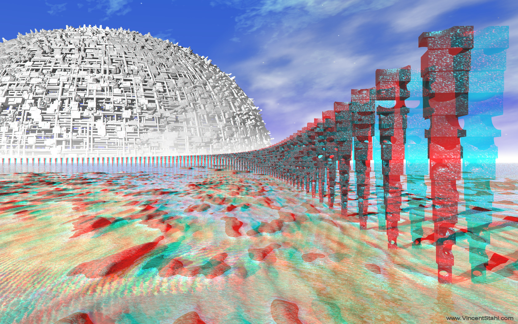 Abstract metal sculpture poles standing on a flat stone ground with shallow water, arranged as a 3D formation into the plane. White Steel Moon with complex pipe architecture at the horizon, forming a scifi background. 3D stereo anaglyph image, coloured with red/cyan encoding. Click image for full view. |