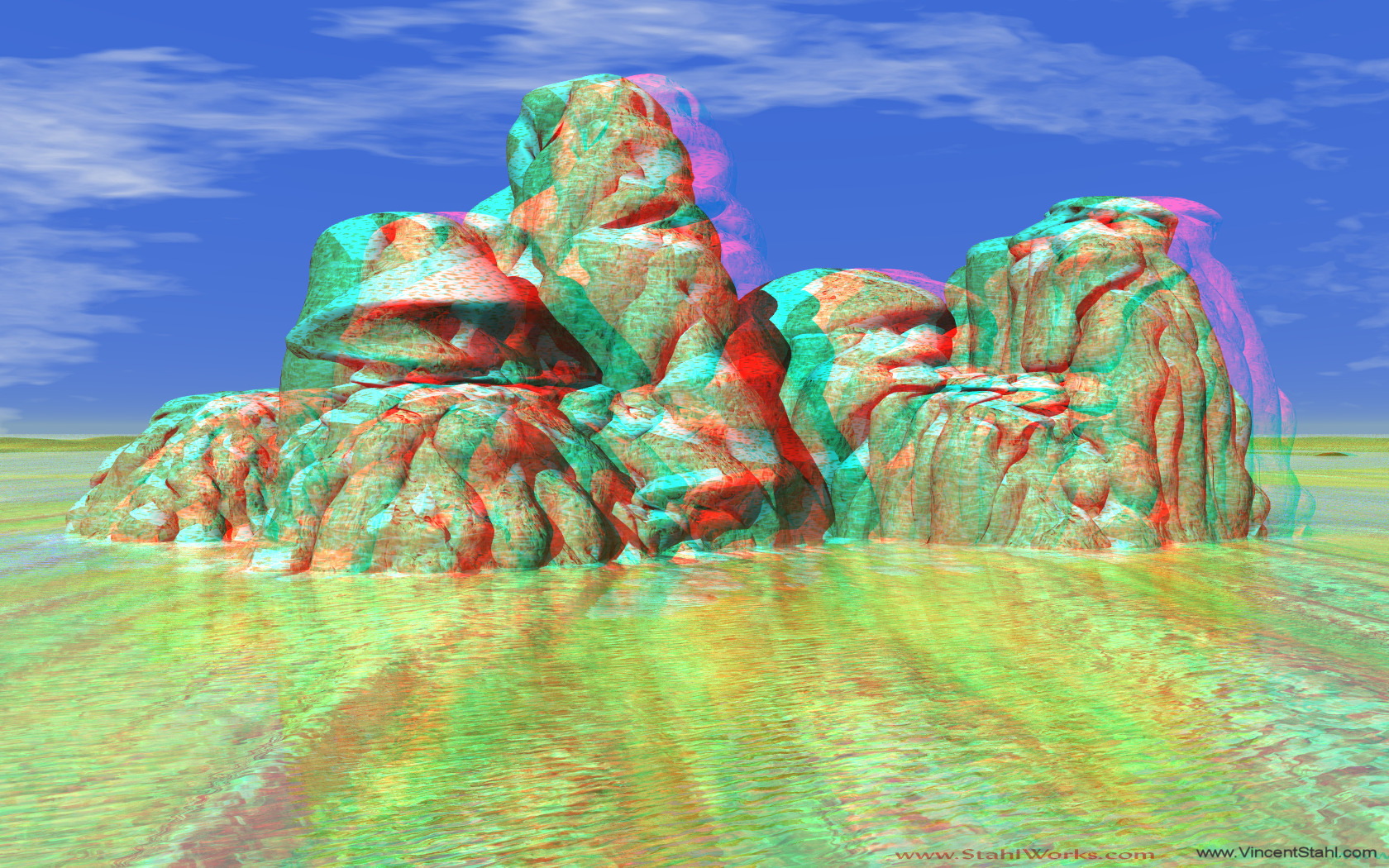 Potato shaped rocks in a shallow lake, random formations of erosion. 3D stereo anaglyph image, coloured with red/cyan encoding. Click image for full view.