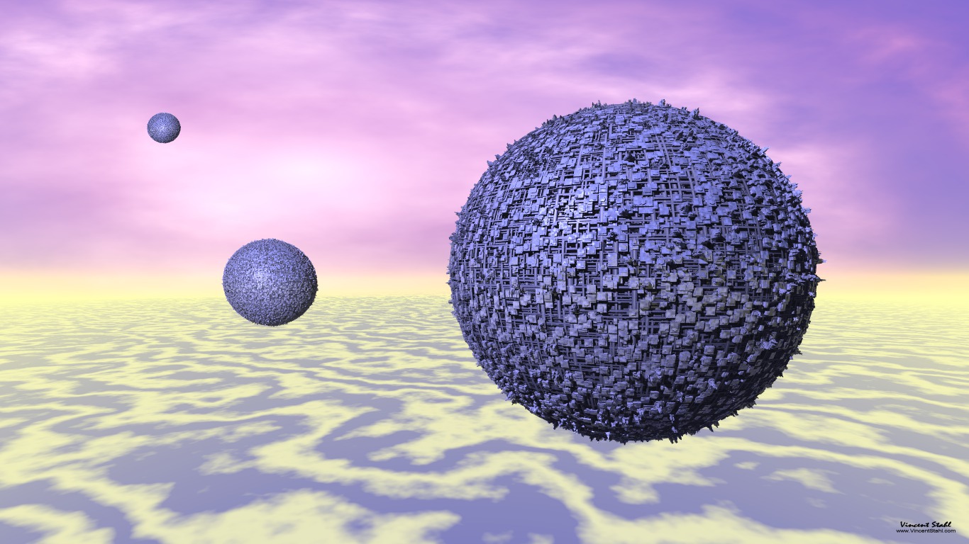 The Steel Moon is an allegory for complex technology systems, assembled from countless modules. Although the blue buildings in this scifi architecture are distributed at random, they have to follow some standard, based on a pipe raster, to form a functional, large unit. Three moons, or satellites, are arranged here in the sky, for a deeper impression against the purple space background. Provided as desktop background for personal, non commercial use.