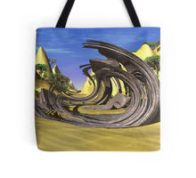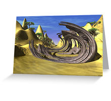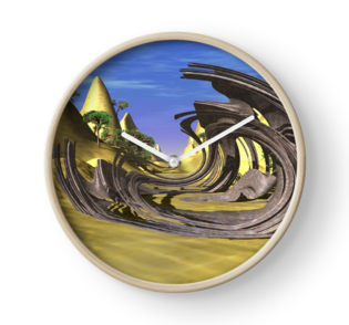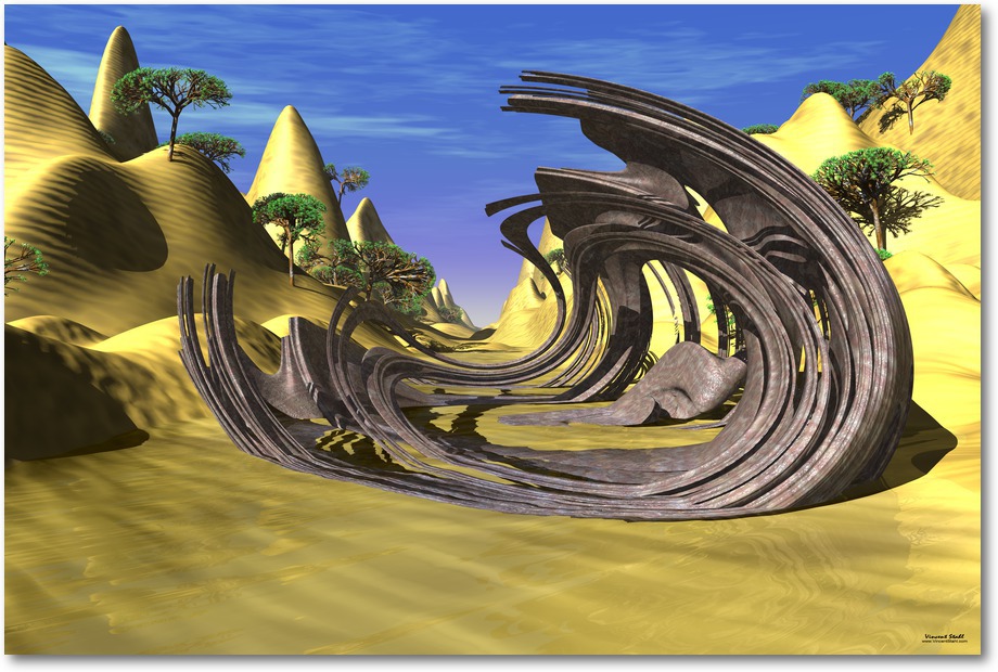 Entry of a desert landscape, contrasted by water in the foreground. Central area dominated by a Quaternion Fractal Sculpture, possibly an abandoned gate to different dimensions.