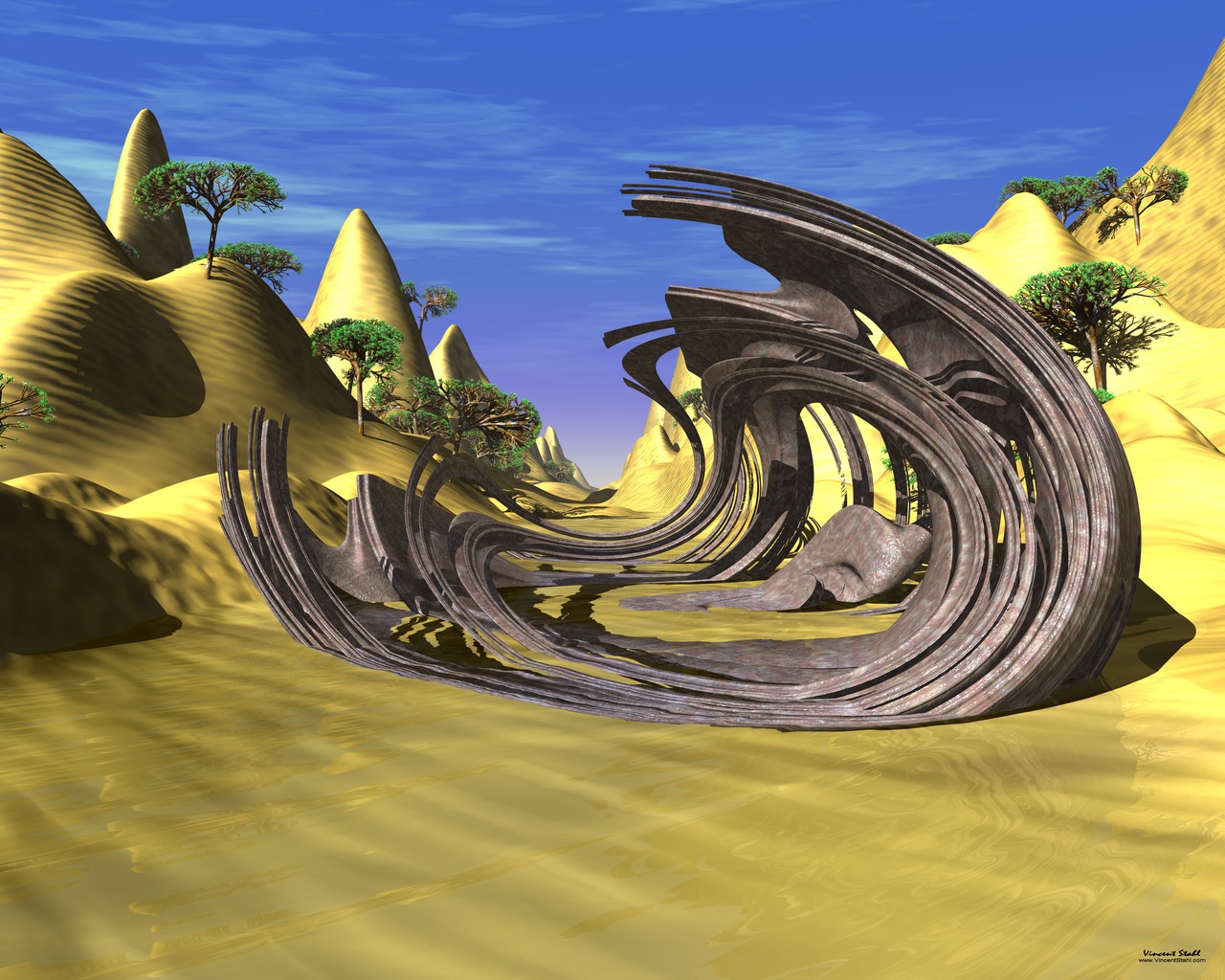 Entry of a desert landscape, contrasted by water in the foreground. Central area dominated by a Quaternion Fractal Sculpture, possibly an abandoned gate to different dimensions.