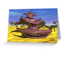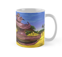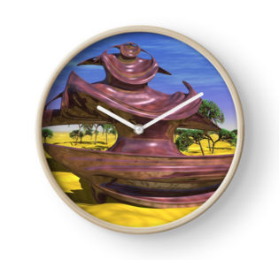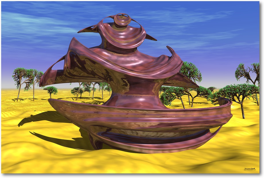Round, brown fractal sculpture associating the form of a Scarabaeus beetle, which was worshipped by the old Egyptians. Therefore this sculpture is placed in sand desert hills, accompanied by fractal trees.