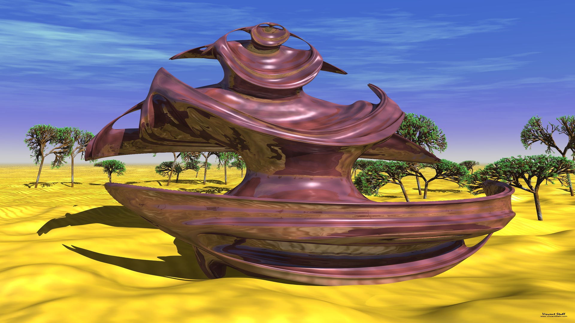 Round, brown fractal sculpture associating the form of a Scarabaeus beetle, which was worshipped by the old Egyptians. Therefore this sculpture is placed in sand desert hills, accompanied by fractal trees. Part of the Vincent Stahl desktop wallpapers for personal, non commercial use. |