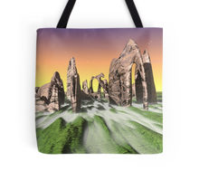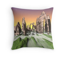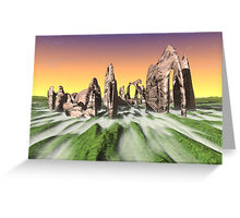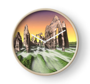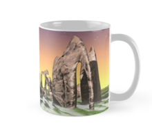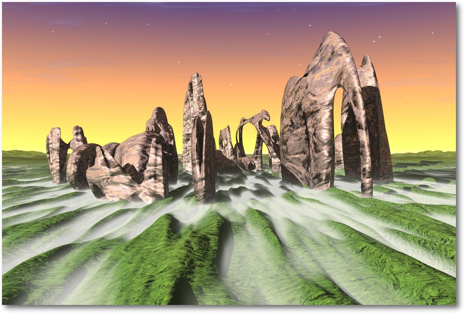 A group of rocks, based on Fractal sculptures, rests in a moss-green lowland. The quietness is intensified by the crack of dawn, with an orange-purple sky and some fog covering the ground. The main rock, shaped like a mammoth, still seems to sleep.