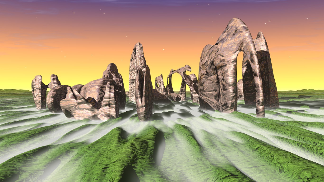 A group of rocks, based on Fractal sculptures, rests in a moss-green lowland. The quietness is intensified by the crack of dawn, with an orange-purple sky and some fog covering the ground. The main rock, shaped like a mammoth, still seems to sleep. Provided as desktop background for personal, non commercial use. |