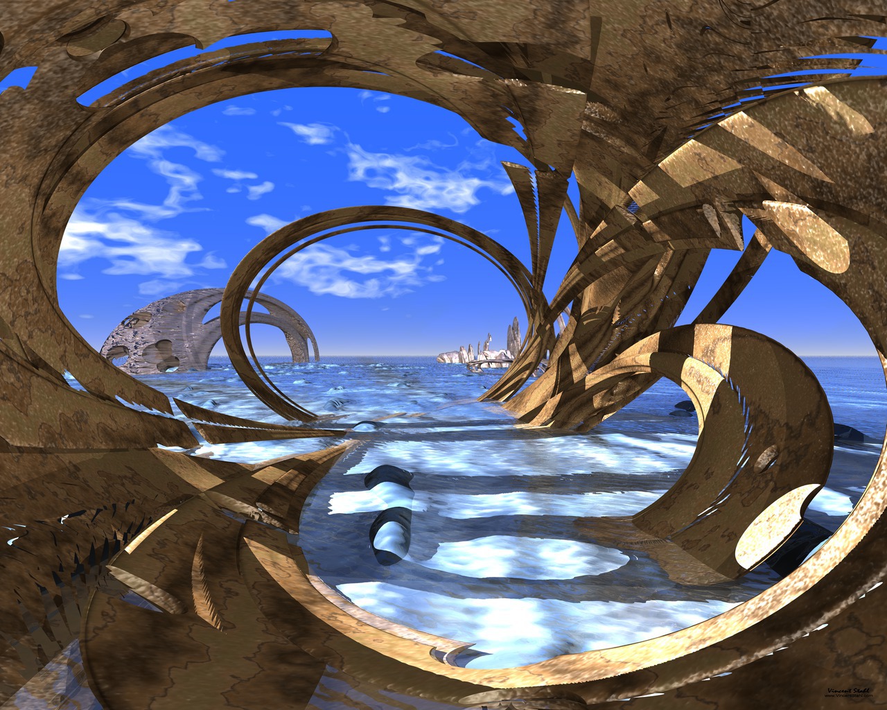 Out of a brown petrified wood cave, a round formation based on a 4D fractal, the view goes out onto a caribbean-like seascape with warm, shallow water. In the distance, unusual rock formations can be seen, made from further hyperspace sculptures. Provided as desktop wallpaper for personal, non commercial use. |