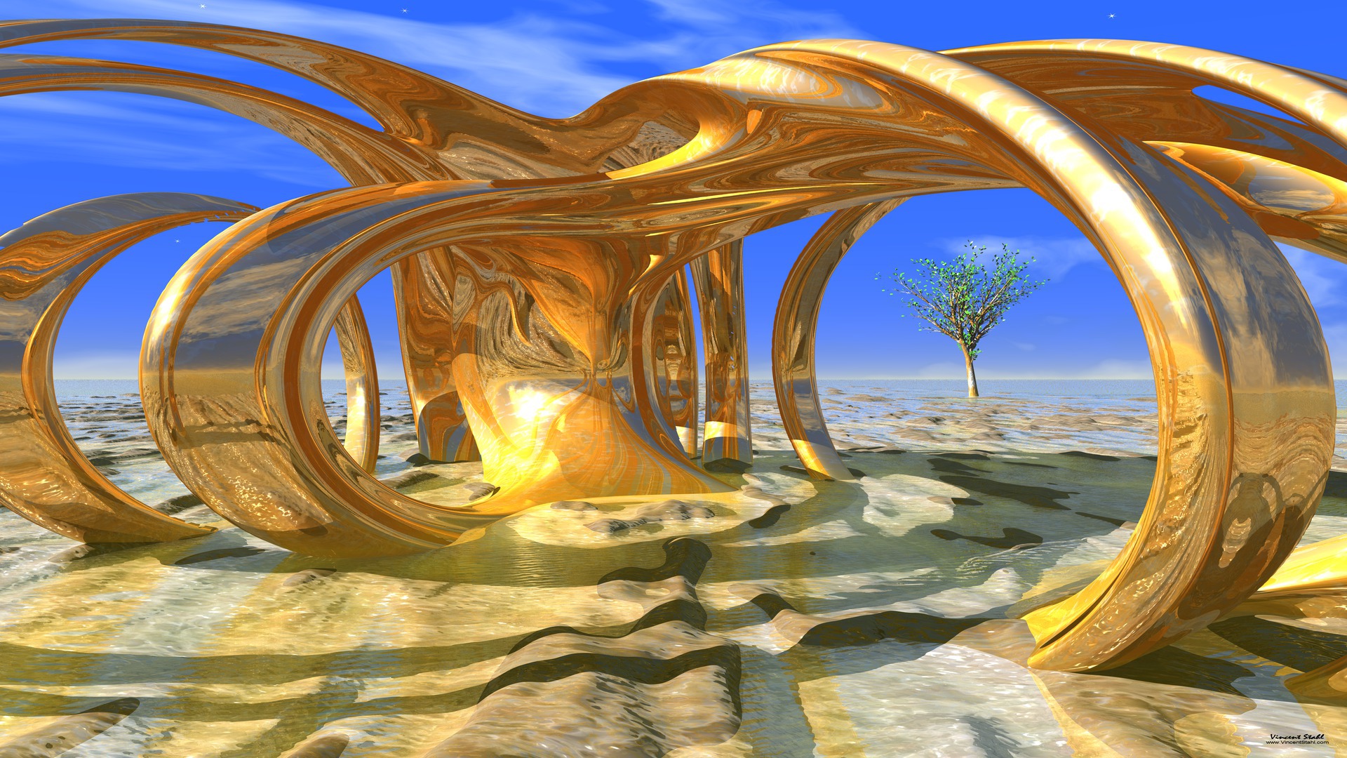Massive, yellow-golden fractal sculpture taken from 4d hyperspace. Highly polished metal surface with landscape reflections. Stony ground with shallow water. Sunlight from the left top. Part of the Vincent Stahl desktop wallpapers for personal, non commercial use. |