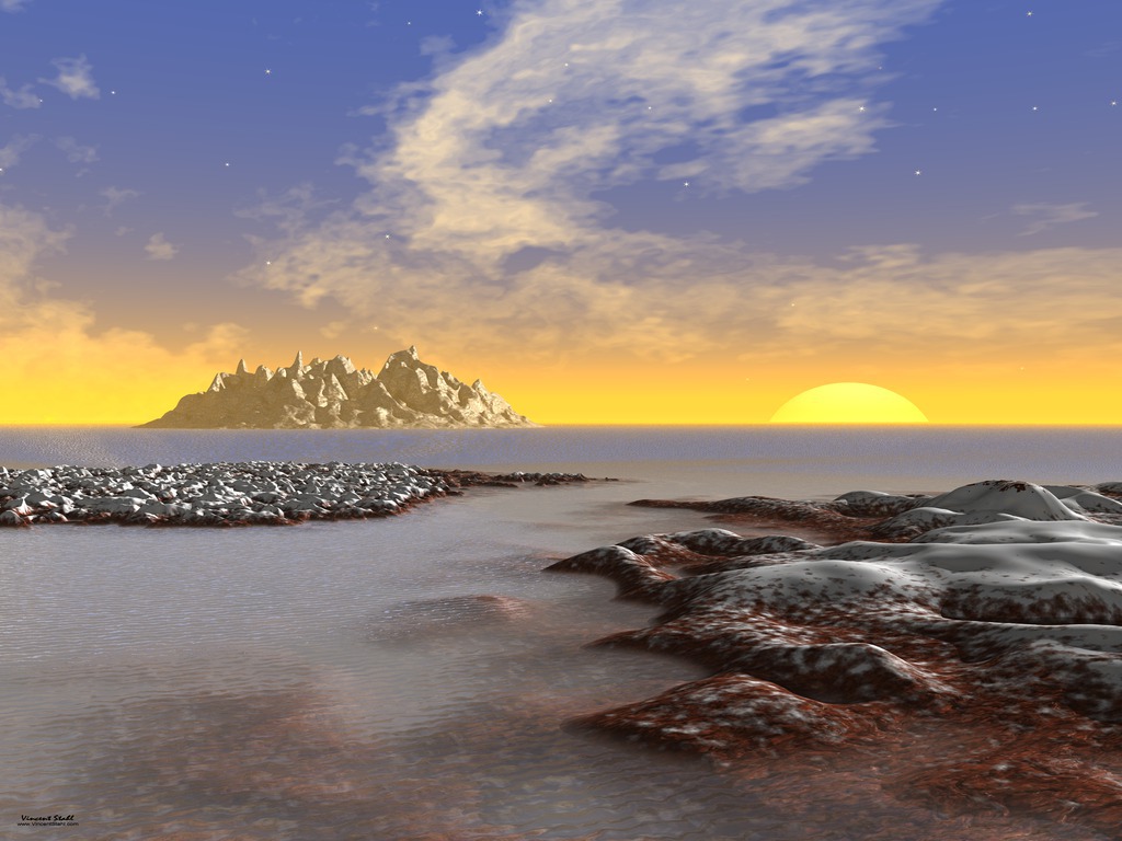 Sunset with an iceberg in the background, shallow red-white snowy coastline in the foreground. Orange sun at the horizon. Blue evening sky with stars. Virtual photo of computer generated scenery.