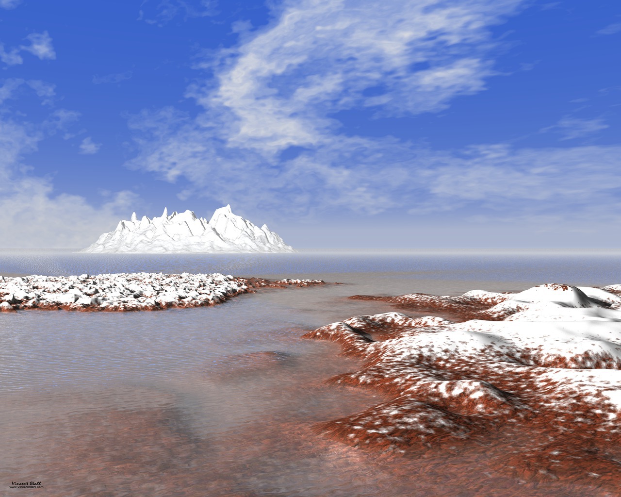 Coastline with red rocks, topped by white snow, surrounded by shallow water. Iceberg at the horizon. Open seascape in the escape point. Silent meditation landscape with sunlight from the left top. Provided as desktop wallpaper for personal, non commercial use. |