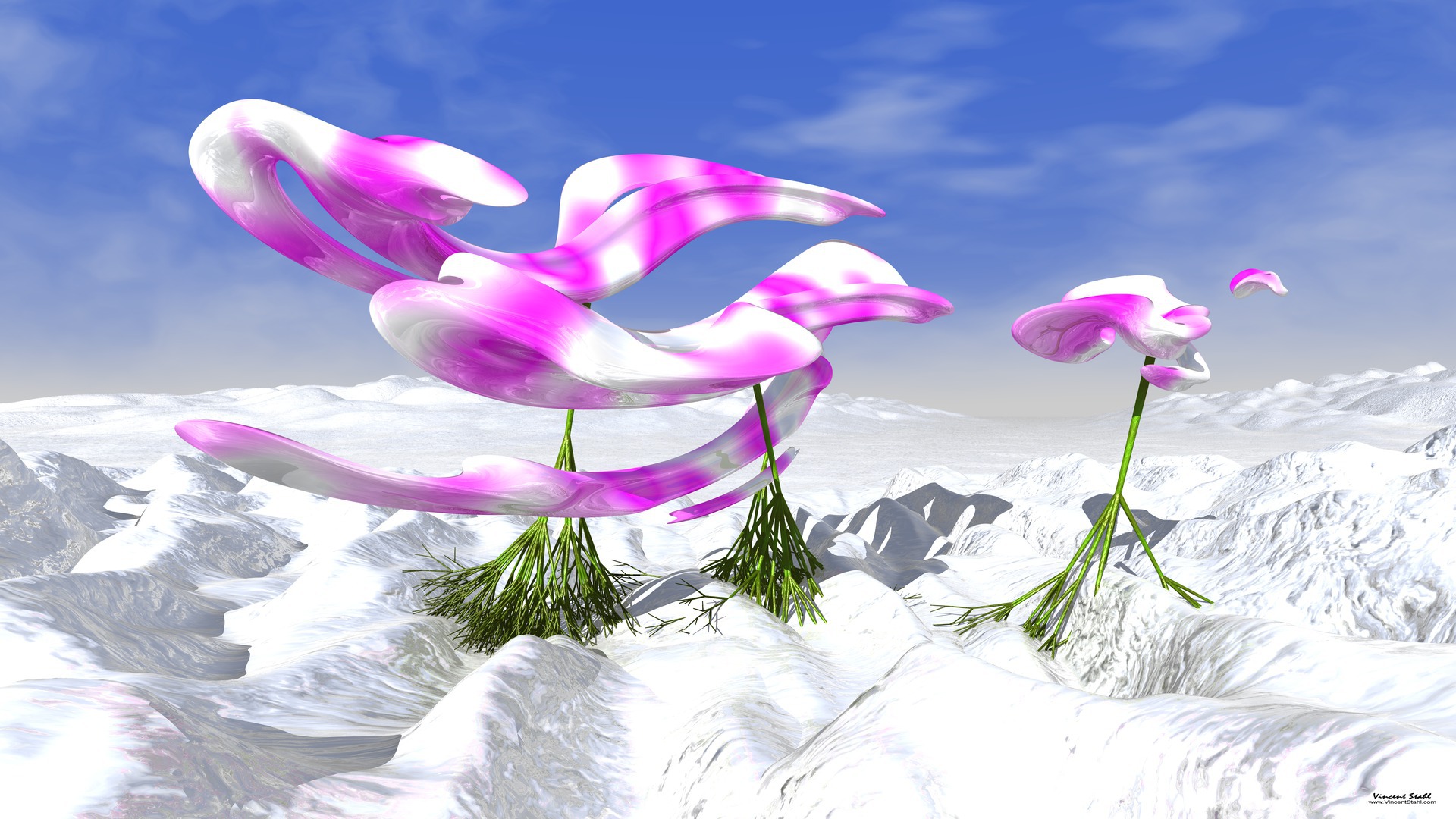 A group of pink-white orchids, flowers based on 4D fractal formations, located in a winter landscape with snow covered hills. Part of the Vincent Stahl desktop wallpapers for personal, non commercial use.