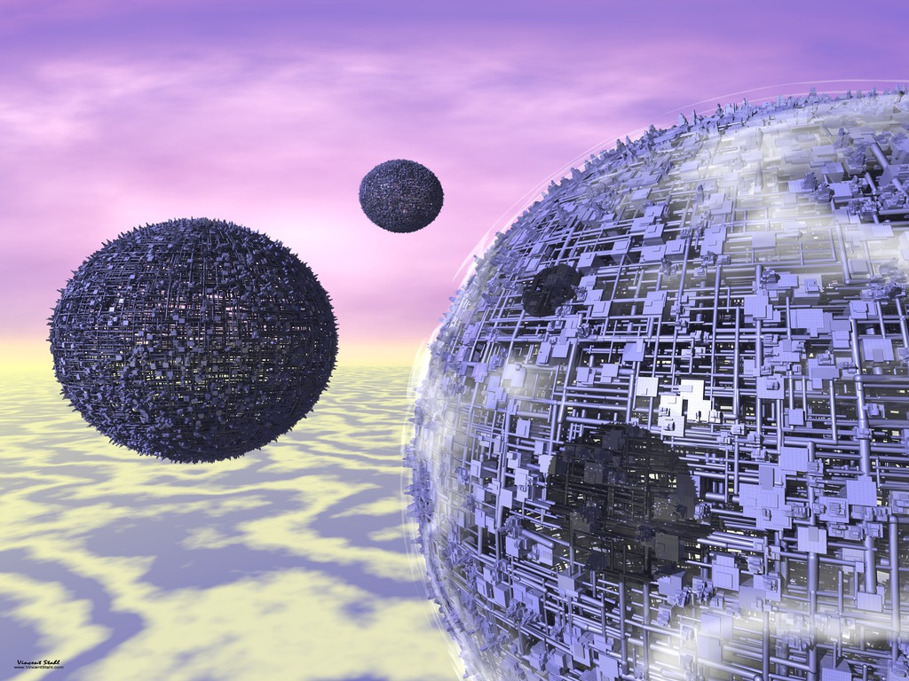 Three blue moons, fractal formations based on thousands of multi layered steel pipes with buildings on top, the largest moon covered with slight clouding. A space installation of scifi architecture, with the two smaller moons acting as satellites. Purple outer space background with clouds. Virtual photo of computer generated scenery. |