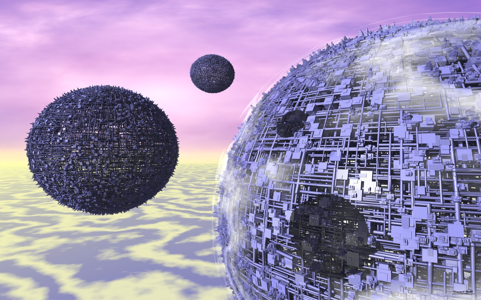 Three blue moons, fractal formations based on thousands of multi layered steel pipes with buildings on top, the largest moon covered with slight clouding. A space installation of scifi architecture, with the two smaller moons acting as satellites. Purple outer space background with clouds. Part of the Vincent Stahl desktop backgrounds for personal, non commercial use. |