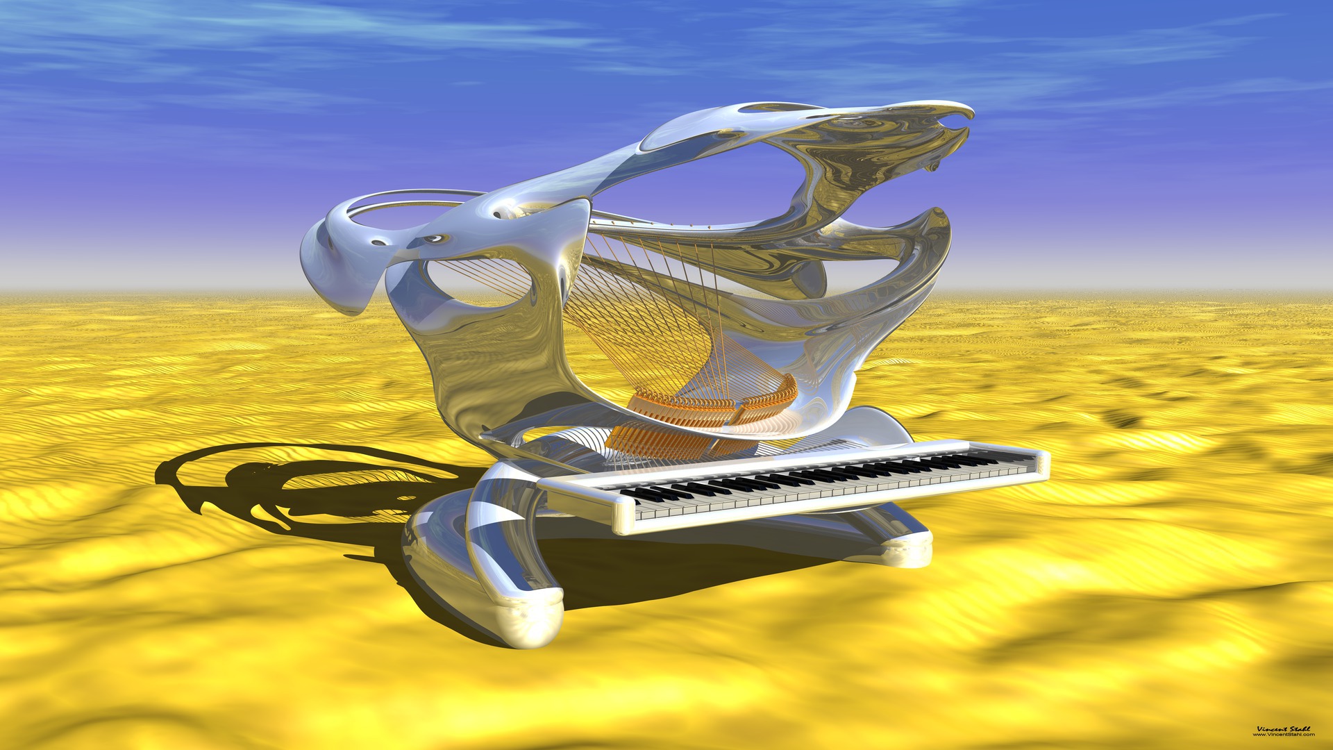 White piano design study in a flat sand desert. Based on an excerpt of a fractal 4D sculpture, this music instrument looks wild and open, like a shark fish. Future design of industrial goods and even pianos will be more and more influenced by the power of fractal form finding. Part of the Vincent Stahl desktop wallpapers for personal, non commercial use. |