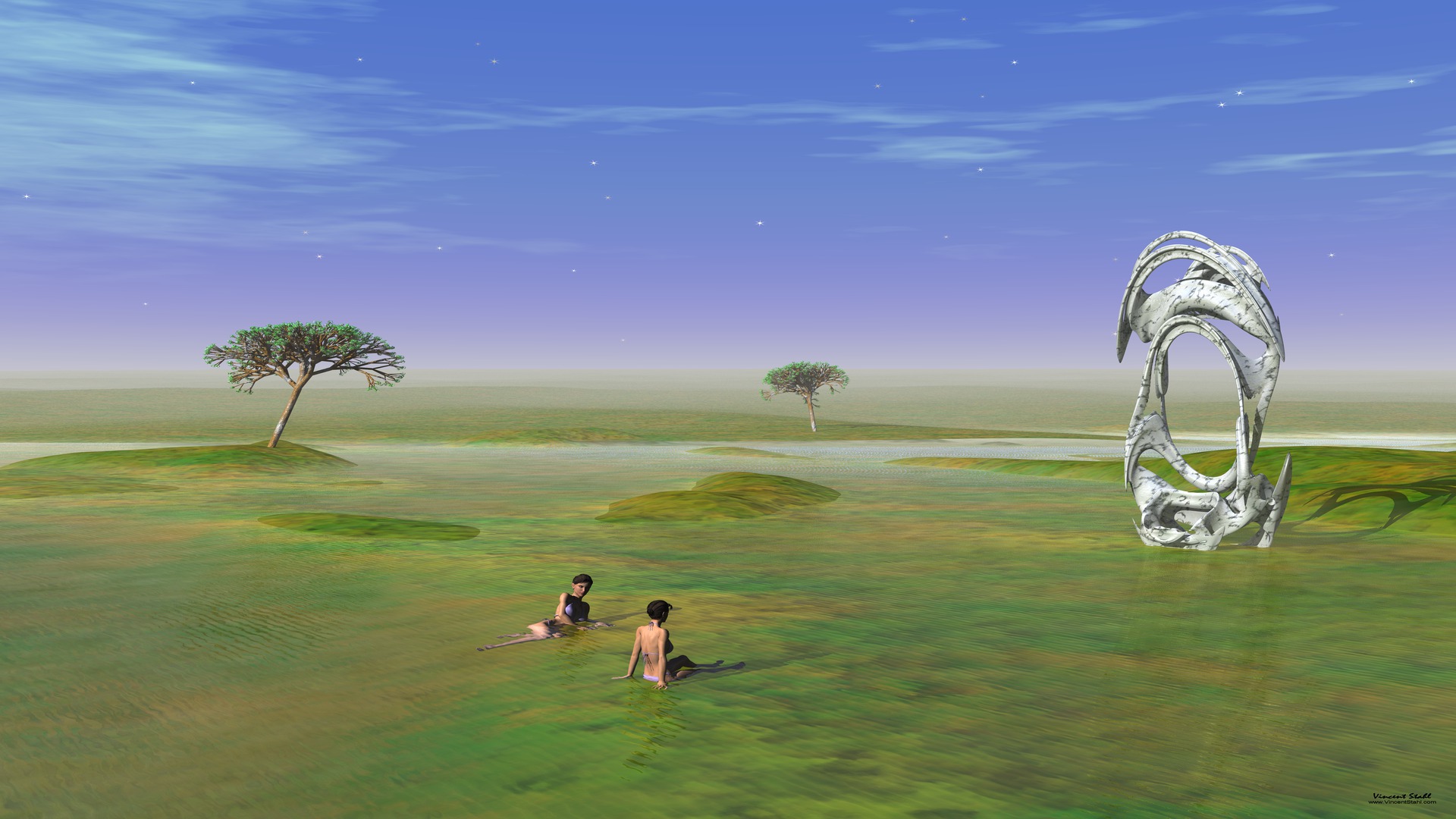 Landscape with shallow waters, fractal trees and a single, white marble fractal sculpture. Green meadows covered with shallow water, soft fog of dawn around the horizon. Two bathing women in front of the sculpture. Fractal hyperform sculpture, and two bathing women. Part of the Vincent Stahl desktop wallpapers for personal, non commercial use. |