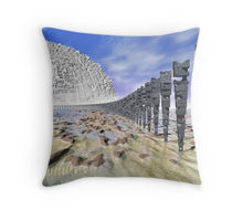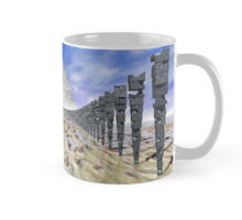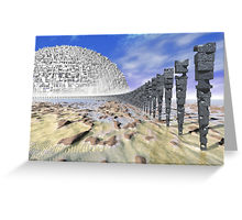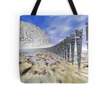 Abstract metal sculpture poles standing on a flat stone ground with shallow water, arranged as a 3D formation into the plane. White Steel Moon with complex pipe architecture at the horizon, forming a scifi background.