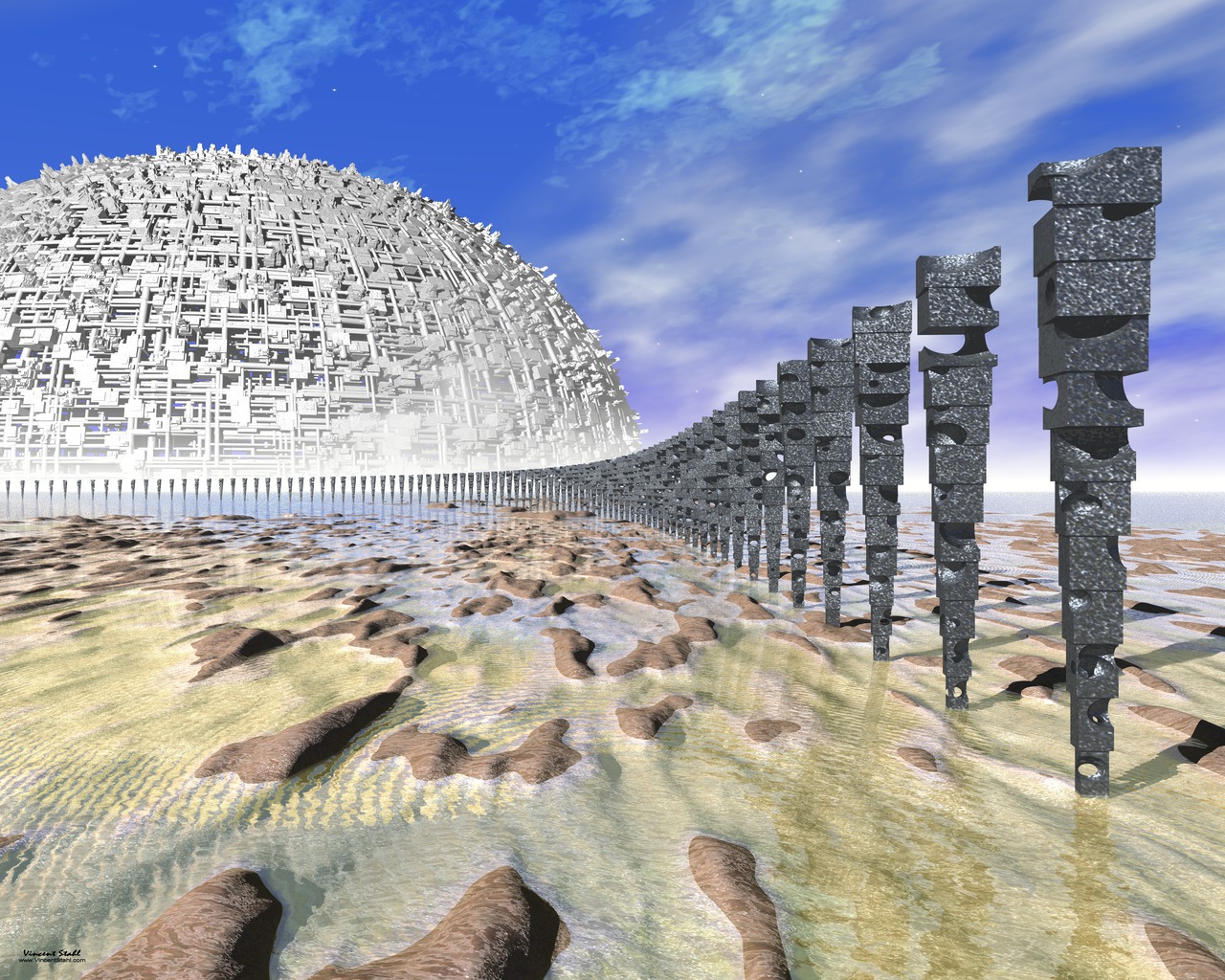 Abstract metal sculpture poles standing on a flat stone ground with shallow water, arranged as a 3D formation into the plane. White Steel Moon with complex pipe architecture at the horizon, forming a scifi background. Provided as desktop wallpaper for personal, non commercial use. |