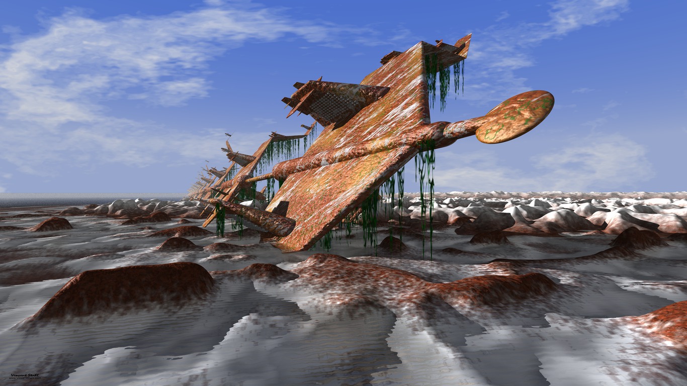 Rusty space ship within a frozen landscape.