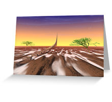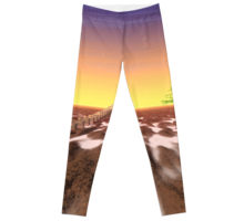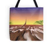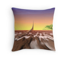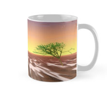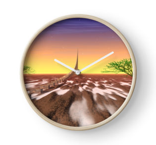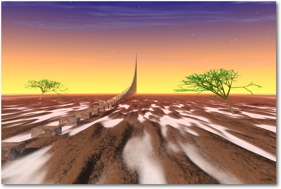 Long sculpture of stepping stones, forming a stairway to heaven, within brown earth field or acres, topped by shallow fog formations. Green fractal trees to the left and right. Yellow-orange horizon.